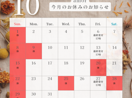 2023/10/05いつもamorご利用いただきまして誠にありがとうございます🌿🍂🍁 下記の通り休業日をご案内申し上げます。 1日【日】、8日【日】、9日【月】、15日【日】、20日【金】... -
